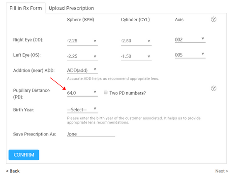 2. If you have two numbers in your prescription, such as "32/32", please click "Two PD numbers?" and fill in 32/32.